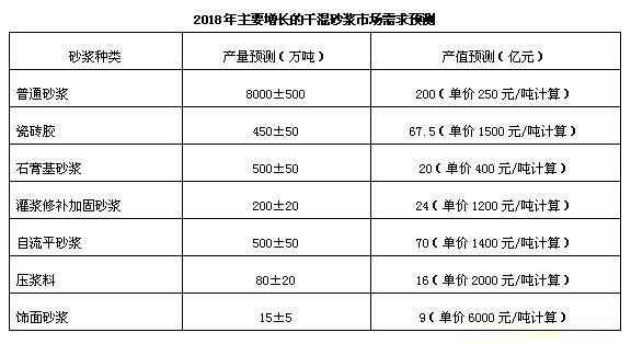 2013年,由于年初大面積、長(zhǎng)時(shí)間的霧霾事件,引起了政府的高度重視,從國(guó)務(wù)院到各省市政府紛紛出臺(tái)大氣污染防治政策。“建筑揚(yáng)塵”成為眾矢之的,禁止 現(xiàn)場(chǎng)攪拌砂漿的力度提升到前所未有的高度。從發(fā)展趨勢(shì)來(lái)看,無(wú)論建筑市場(chǎng)如何波動(dòng),干混砂漿都將保持兩位數(shù)的增長(zhǎng)。未來(lái)幾年期內(nèi),我國(guó)干混砂漿市場(chǎng)將有一 個(gè)較快幅度的穩(wěn)定增長(zhǎng)。經(jīng)匯總專(zhuān)家、顧問(wèn)意見(jiàn),采用類(lèi)比法、德菲爾法等綜合測(cè)算, 2018年各類(lèi)砂漿市場(chǎng)預(yù)測(cè)統(tǒng)計(jì):